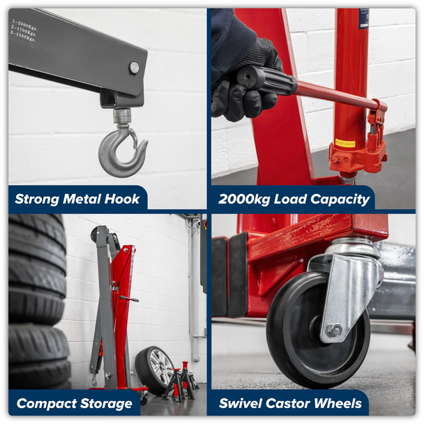 HEAVY-DUTY FRAME - 2 Tonne Folding crane with heavy-duty forged hook.