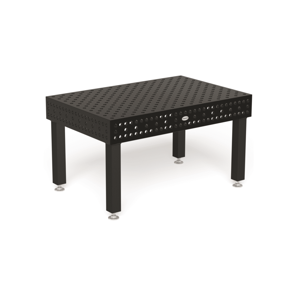 Siegmund System 28 Extreme 8.7 is manufactured through-hardened tool steel out of special alloy (Siegmund X8.7) and additionally plasma-nitration and BAR-coating. Based on the increased load capacity of the welding table it is especially suited for working with heavy components with a load capacity of 6000kg. Dimensions of the System 28 table are 1500mm x 1000mm. (Range available from 1000mm x 1000mm to 4800mm x 2400mm.) This table comes with standard legs (650mm).